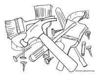The TOOLS theme package, as seen on the left, includes: four coloring pages, the cover page, and the tips on coloring page.